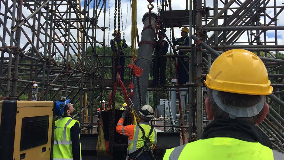 We had to remove the cylinders via a special scaffolding (You can see on top of the dam wall) as a crane could not reach and repaired them in our Cork facility…